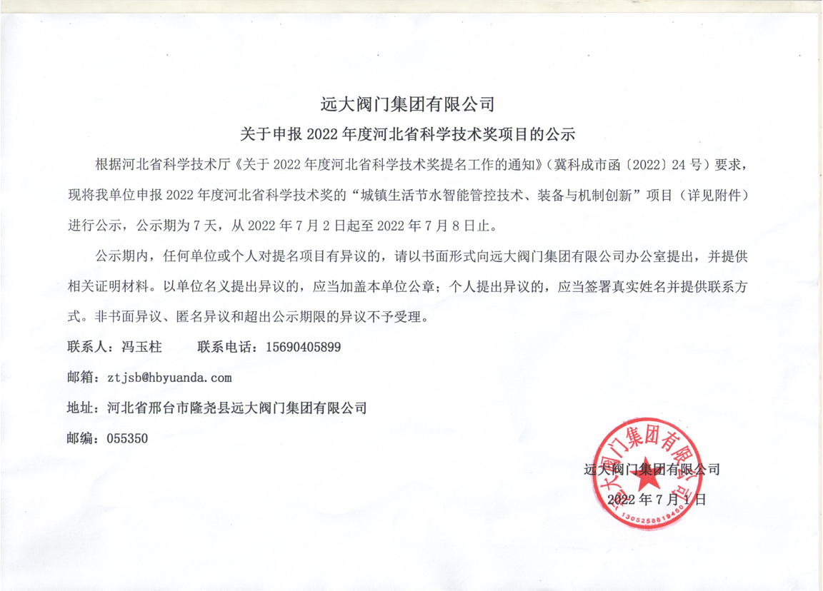 遠(yuǎn)大閥門集團(tuán)有限公司關(guān)于申報(bào)2022年度河北省科學(xué)技術(shù)獎(jiǎng)項(xiàng)目的公示 根據(jù)河北省科學(xué)技術(shù)廳《關(guān)于2022年度河北省科學(xué)技術(shù)獎(jiǎng)提名工作的通知》(冀科成市函〔2022〕24號)要求,現(xiàn)將我單位申報(bào)2022年度河北省科學(xué)技術(shù)獎(jiǎng)的“城鎮(zhèn)生活節(jié)水智能管控技術(shù)、裝備與機(jī)制創(chuàng)新”項(xiàng)目(詳見附件)進(jìn)行公示,公示期為7天,從2022年7月2日起至2022年7月8日止。 公示期內(nèi),任何單位或個(gè)人對提名項(xiàng)目有異議的,請以書面形式向遠(yuǎn)大閥門集團(tuán)有限公司辦公室提出,并提供相關(guān)證明材料。以單位名義提出異議的,應(yīng)當(dāng)加蓋本單位公章;個(gè)人提出異議的,應(yīng)當(dāng)簽署真實(shí)姓名并提供聯(lián)系方式。非書面異議、匿名異議和超出公示期限的異議不予受理。