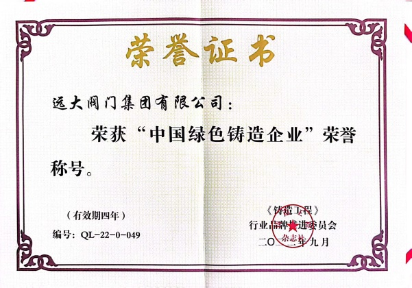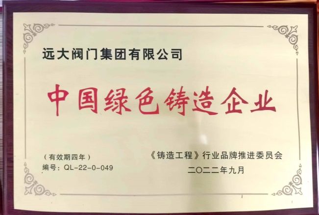 2022年9月20日,中國鑄造協(xié)會在上海組織召開了年會,并舉行了“中國綠色鑄造企業(yè)”榮譽稱號授牌儀式,遠大閥門集團有限公司獲得了“中國綠色鑄造企業(yè)”榮譽稱號。