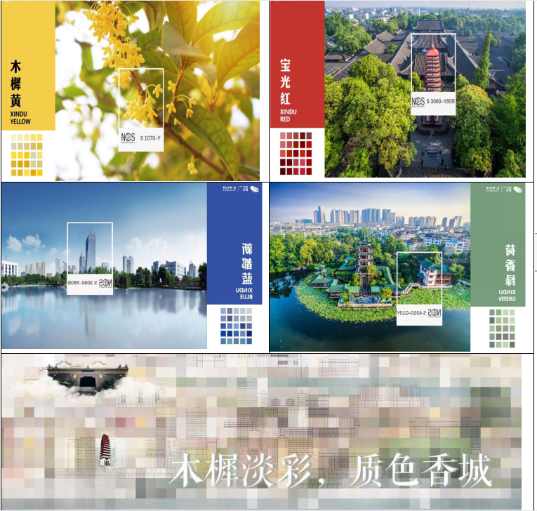 項(xiàng)目團(tuán)隊(duì)運(yùn)用色彩學(xué)的調(diào)研分析方法,通過(guò)溯文脈、理現(xiàn)狀、推主色、定旋律、落應(yīng)用對(duì)新都進(jìn)行梳理,通過(guò)尋找能夠體現(xiàn)新都區(qū)歷史文化傳統(tǒng)和自然色彩基因的城市色彩特征,尋找匹配新都區(qū)光環(huán)境、自然環(huán)境、人文環(huán)境及傳統(tǒng)建筑的城市色彩特征,最終選定以成都天府黃色系為延續(xù),來(lái)源于新都明朝狀元楊升庵“寶書(shū)林中碧玉涼·秋風(fēng)又送木樨黃”詩(shī)句中的“木樨黃”作為新都區(qū)城市色彩特征色主色,以新都?xì)v史建筑的“寶光紅”,新都城市發(fā)展的“新都藍(lán)”,桂湖森林基底的“荷香綠”為特征色色系,并根據(jù)新都的人文歷史、地理特征、城市發(fā)展確定城市色彩基調(diào)“木樨淡彩,質(zhì)色香城”。