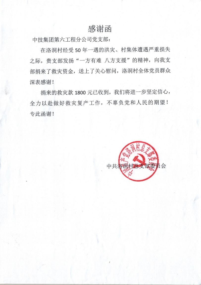6月17日、6月23日第六工程分公司清遠恒大御泉四季花園總承包項目部及第六工程分公司黨支部接連收到了清遠市中共佛岡縣委、佛岡縣人民政府、中共洛洞村總支部委員會的感謝信,感謝信內容主要是針對中技集團清遠恒大御泉四季花園總承包項目部及第六工程分公司黨支部在6月7日至6月9日清遠市佛岡縣發(fā)生的50年一遇的洪災中做出的巨大貢獻表示真誠的感謝。?