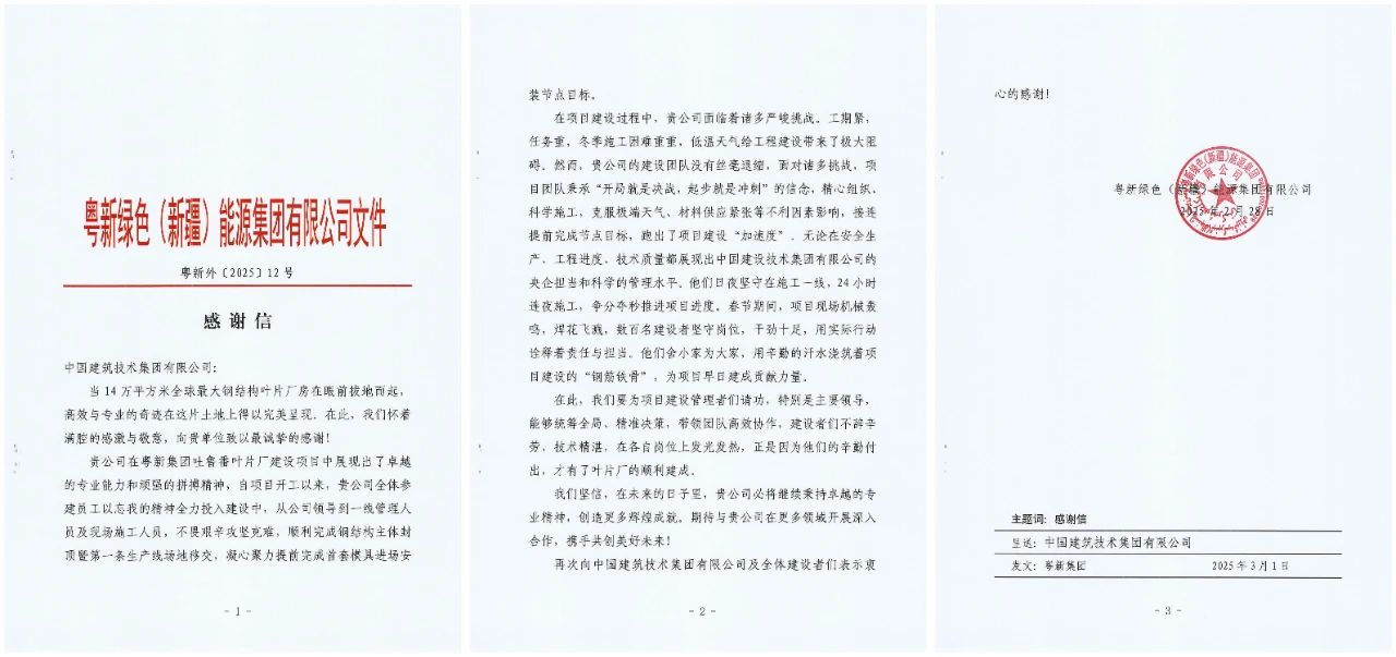近日,中國建技收到明陽智慧能源粵新綠色(新疆)能源集團(tuán)有限公司發(fā)來的感謝信。對(duì)中國建技在14萬平米的全球最大鋼結(jié)構(gòu)葉片廠房——吐魯番葉片廠房項(xiàng)目建設(shè)過程中的優(yōu)異表現(xiàn),給予了充分肯定和真摯感謝。