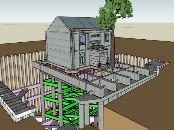 該建筑原為公安部辦公樓,始建于民國時期,是西城區(qū)重點保護文物。建筑占地面積約400平方米,東西長約15米,南北長約14米,地上兩層,地下基坑深度達20米。在該地塊開發(fā)過程中,需在建筑周邊及下方進行基坑開挖,同時西側地鐵19號線太平橋站B口的施工也在同步進行。為確保歷史建筑的安全,項目團隊對其進行了原址托換處理。