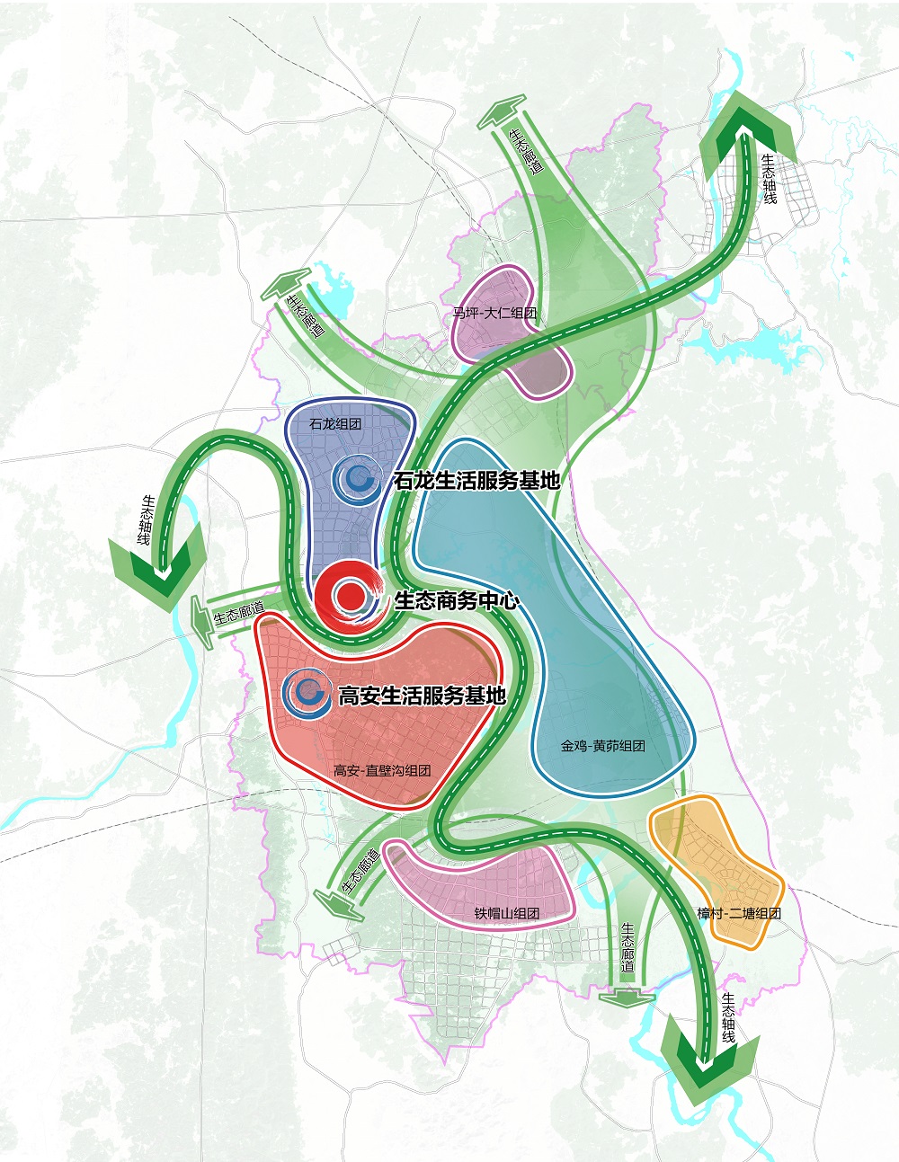 大開大合空間結(jié)構(gòu)——著眼于自然生態(tài)特質(zhì),以水為脈、綠為基、路為廊形成大開的生態(tài)空間,以高度復(fù)合的產(chǎn)業(yè)功能組團形成大合的發(fā)展空間,構(gòu)建一個中心、兩大服務(wù)基地、三大生態(tài)軸線、五大生態(tài)廊道、六大組團的空間發(fā)展格局。