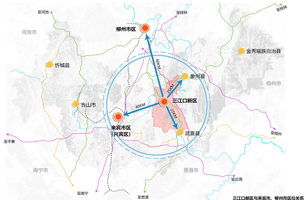 來賓市地處廣西中部地區(qū),緊鄰柳州、南寧兩大核心城市,北距柳州約65公里,西南距南寧約140公里,有“桂中腹地”之稱。三江口新區(qū)位于來賓市東部,是桂中“金三角”核心,也是“西江黃金水道重要節(jié)點”和“南柳經(jīng)濟走廊重要節(jié)點”,區(qū)位優(yōu)勢明顯。