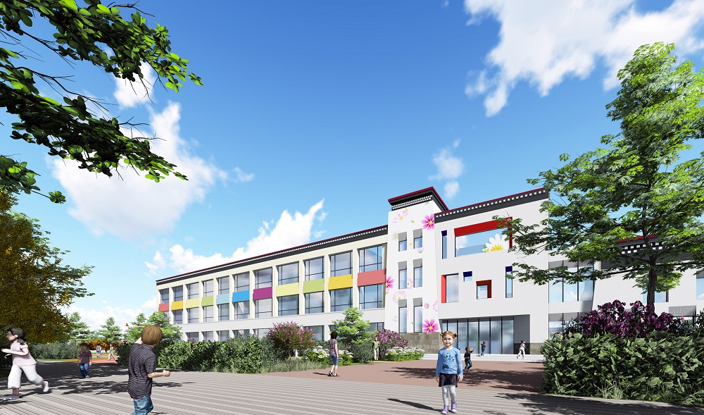 幼兒園建設(shè)響應(yīng)國家相關(guān)政策,為幼兒提供獨(dú)具特色空間的環(huán)境,堅(jiān)持美觀的同時(shí),又能滿足使用功能的合理性。整體設(shè)計(jì)以現(xiàn)代簡潔的處理手法,在充分考慮經(jīng)濟(jì)及美觀性的前提下,體現(xiàn)藏區(qū)建筑特色。立面采用虛實(shí)結(jié)合的處理手法,以橫向線條體聯(lián)系建筑各個(gè)部分,強(qiáng)調(diào)活動(dòng)單元體量,創(chuàng)造富有秩序的立面節(jié)奏,通過明確的進(jìn)退關(guān)系區(qū)分各功能區(qū)塊的轉(zhuǎn)換,塑造強(qiáng)烈的光影變化,為孩子提供自由靈活的生活活動(dòng)場所。