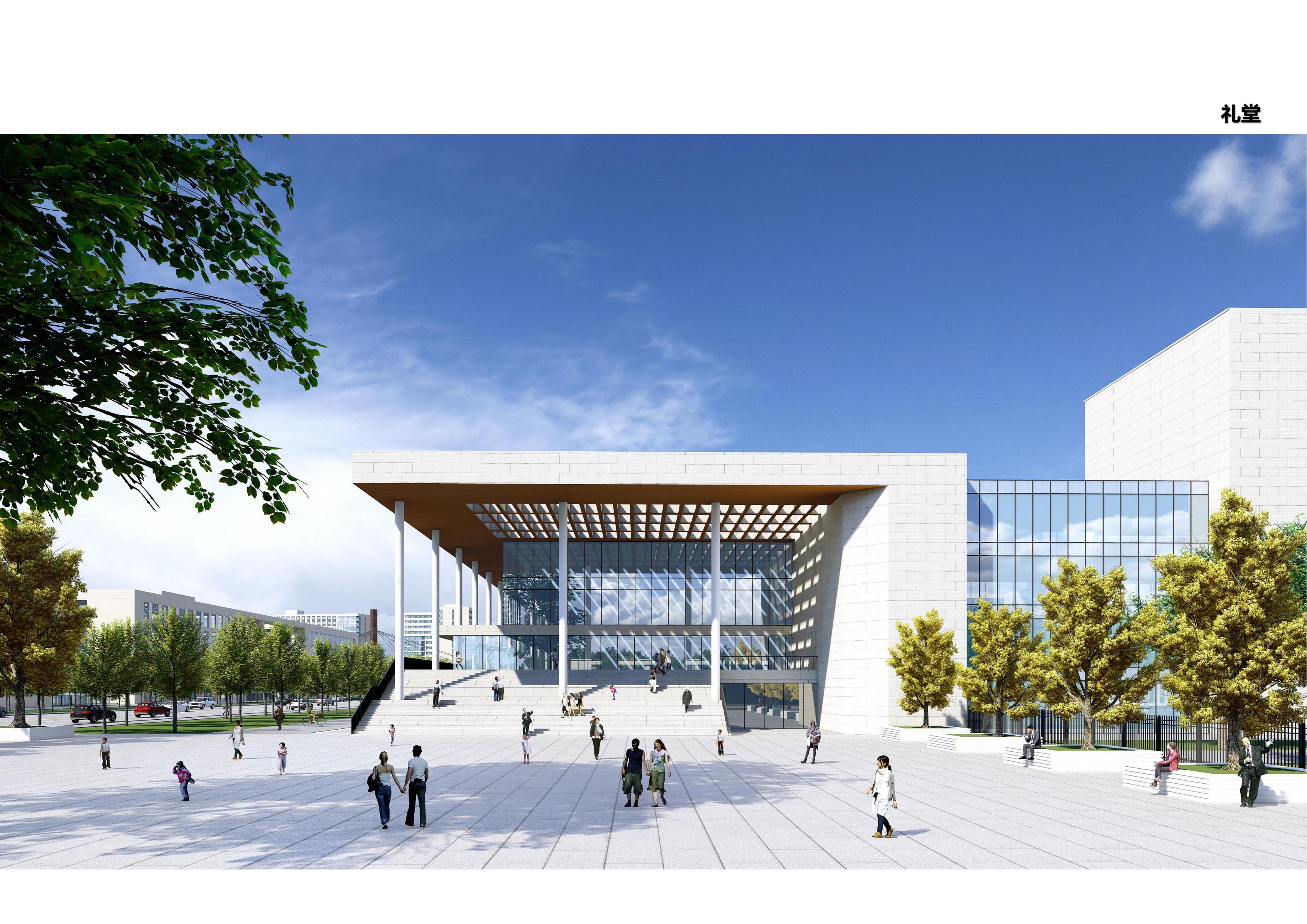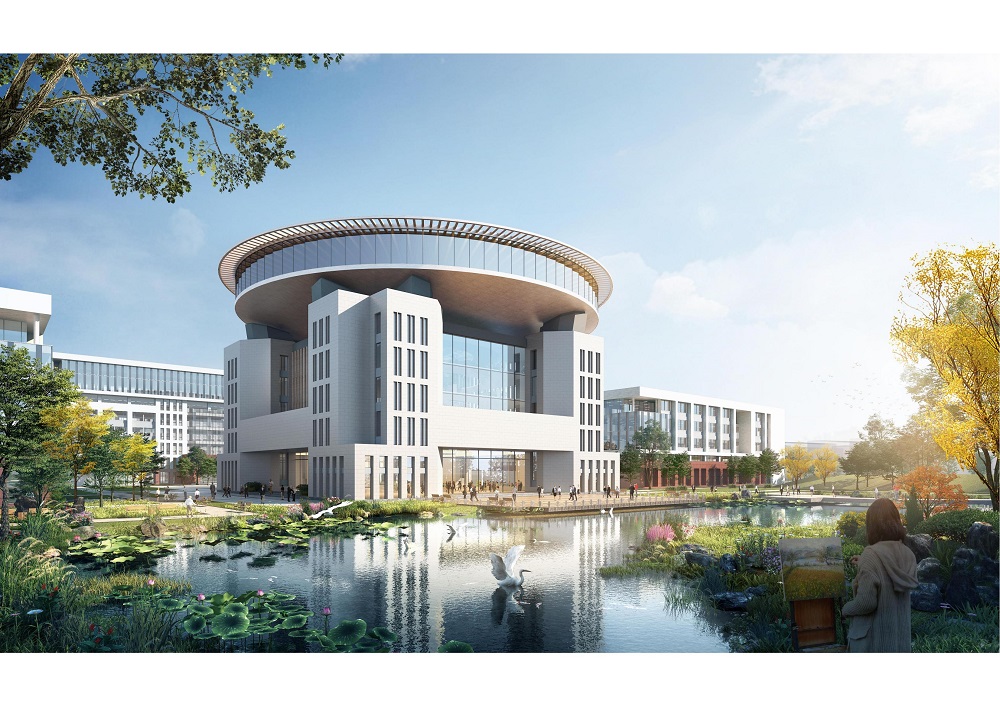 項(xiàng)目核心文化建筑:圖書館與圖書綜合樓,采用左右對(duì)仗形式設(shè)置于東西校區(qū)中心位置。圖書綜合樓以“圓”為頂;圖書館以“方”為體,體現(xiàn)“天圓地方” 的中國傳統(tǒng)宇宙觀 。