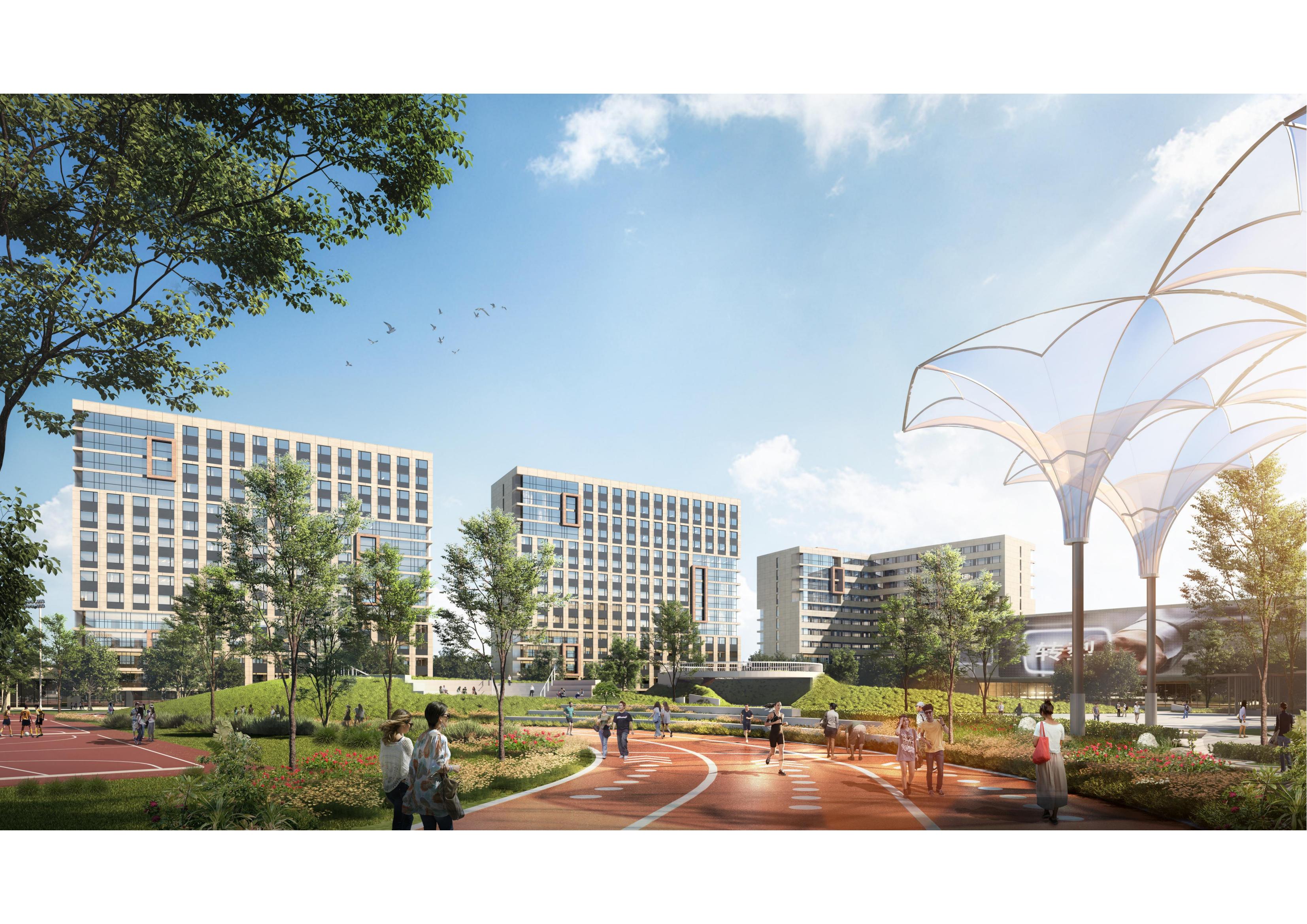 生活區(qū)景觀以“玉如意”為意向,勾勒出學(xué)生活動(dòng)場(chǎng)地、體育運(yùn)動(dòng)場(chǎng)地、集會(huì)休閑場(chǎng)地等形象,連接?xùn)|西地塊,營造了活潑怡人的生活氛圍。